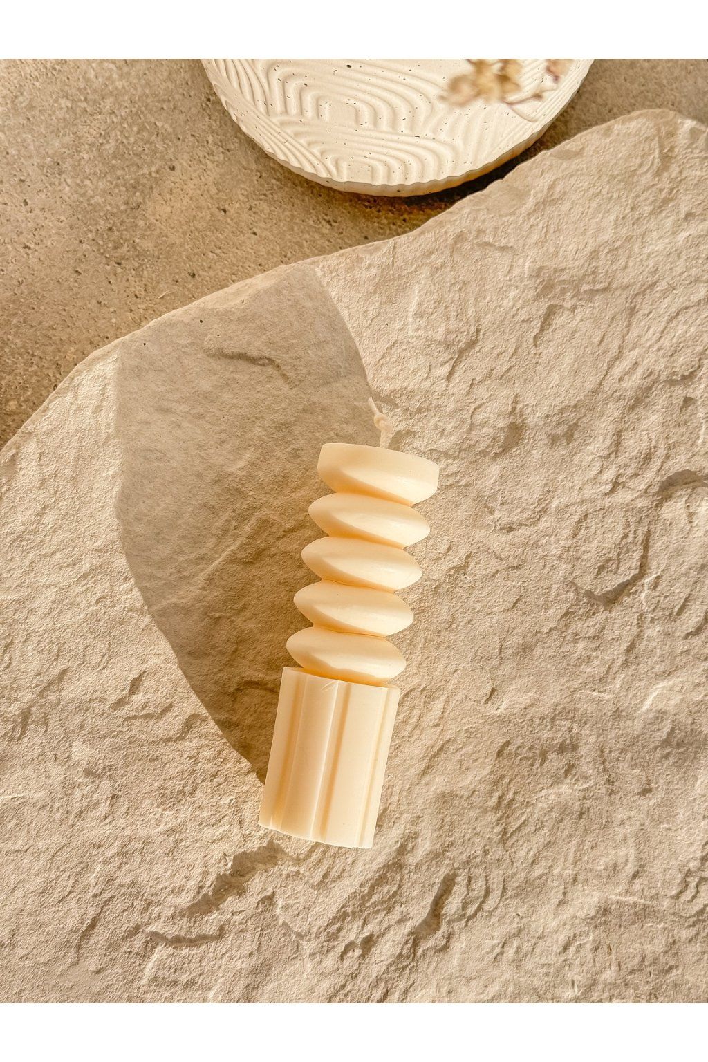 Farba sviečky je jemne ivory. Na fotke môže byť farba sviečky jemne zmenená v dôsledku pôsobenia svetla.